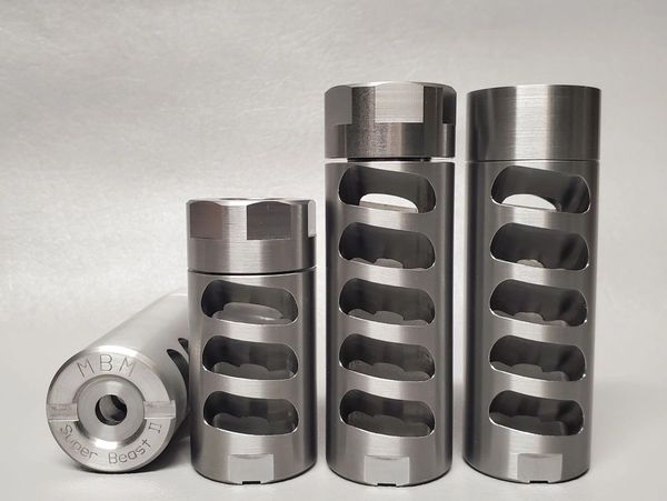 The Super Beast II brakes are 1.260" OD and are available in 5/8x24 and 3/4x24. They are also available with 2 different caps. One has a very slight edge break to work on 1.25" barrels and the other is a hex machined cap for use with a wrench. The wrench flat brakes are tapered to 1.175. All of the caps can be tapered as small as .820 for 5/8x24 and .940 for 3/4x24. The wrench flat cap adds 10.00 to the cost.