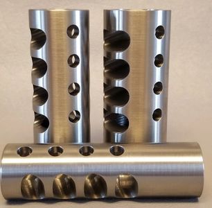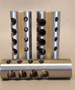 A little info about my ported brakes......these were the first brakes I started selling. They are fairly effective, as you can see in some of my videos, but they have some downsides to them. The top holes tend to cause too much down thrust on smaller diameter sporter barrels and large capacity cases. The negatives to that is the barrel can make contact with the stock if there isn't enough clearance and it can make it harder to spot shots because it's essentially pushing the barrel past what your trying to look at when firing a shot. A lot of people seem to think ports or holes without a opposing side is detrimental to accuracy. The top holes don't have equal holes on the bottom to oppose them which causes uneven forces. I haven't noticed a difference in accuracy because of that but some believe it does cause issues.